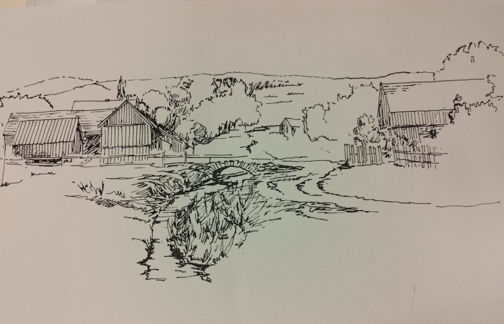 PODGÓRSKA WIOSKA rys. tuszem 25x40 cm w oprawie